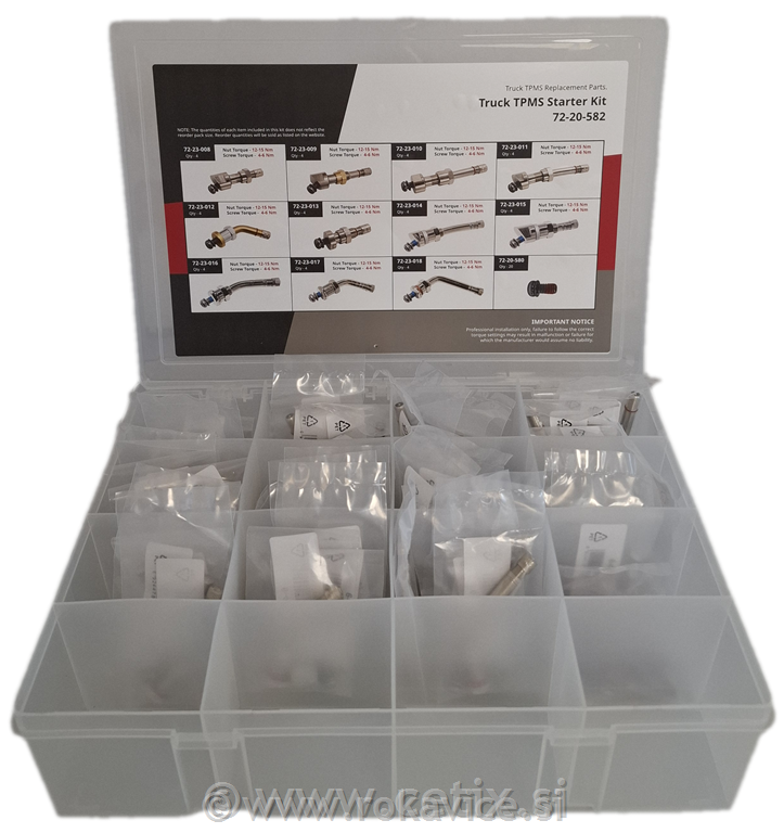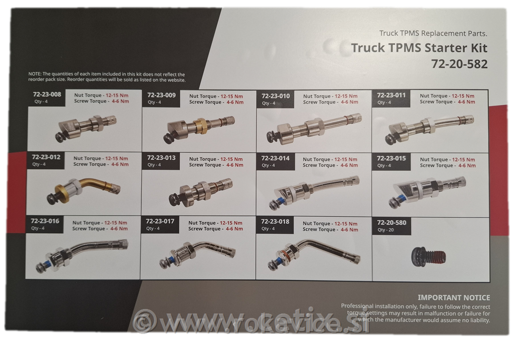 - Standardni tovorni TPMS ventili: 24 kosov (različnih dolžin od 40 mm do 77 mm in kotov od 0° do 27°).