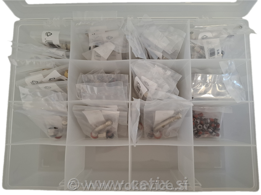 Set je shranjen v trpežni embalaži s predelki, ki omogoča pregledno upravljanje z zalogo in zaščito komponent.