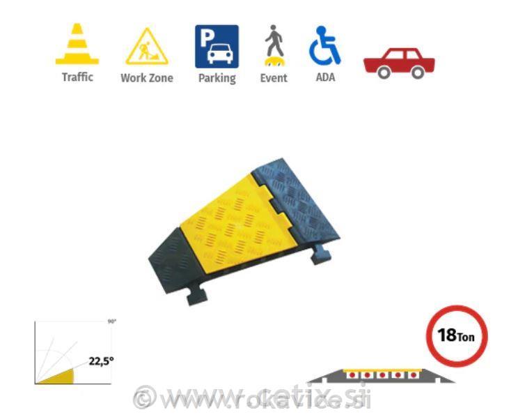 Modularni kotni element iz vulkanizirane gume z rumeno PVC prevleko, idealen za preusmeritev kabelske poti v okoljih z veliko prometa, kot so gradbišča, dogodki in demonstracije.