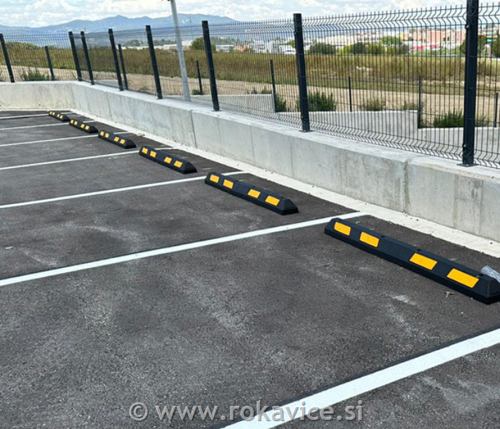 Omejevalniki koles DH-PB, izdelani iz odporne gume z rumenimi ali belimi odsevniki, preprečujejo poškodbe vozil, ščitijo pločnike in stene ter olajšajo parkiranje v garažah in na parkiriščih.